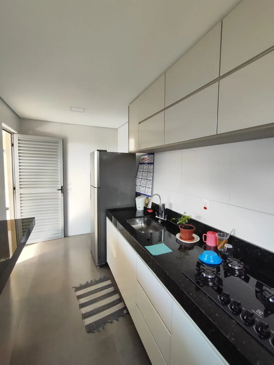 Cozinha planejada com armários, fogão elétrico, micro-ondas e geladeira