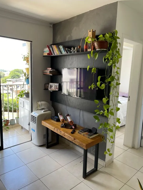 Sala com painel para TV e varanda