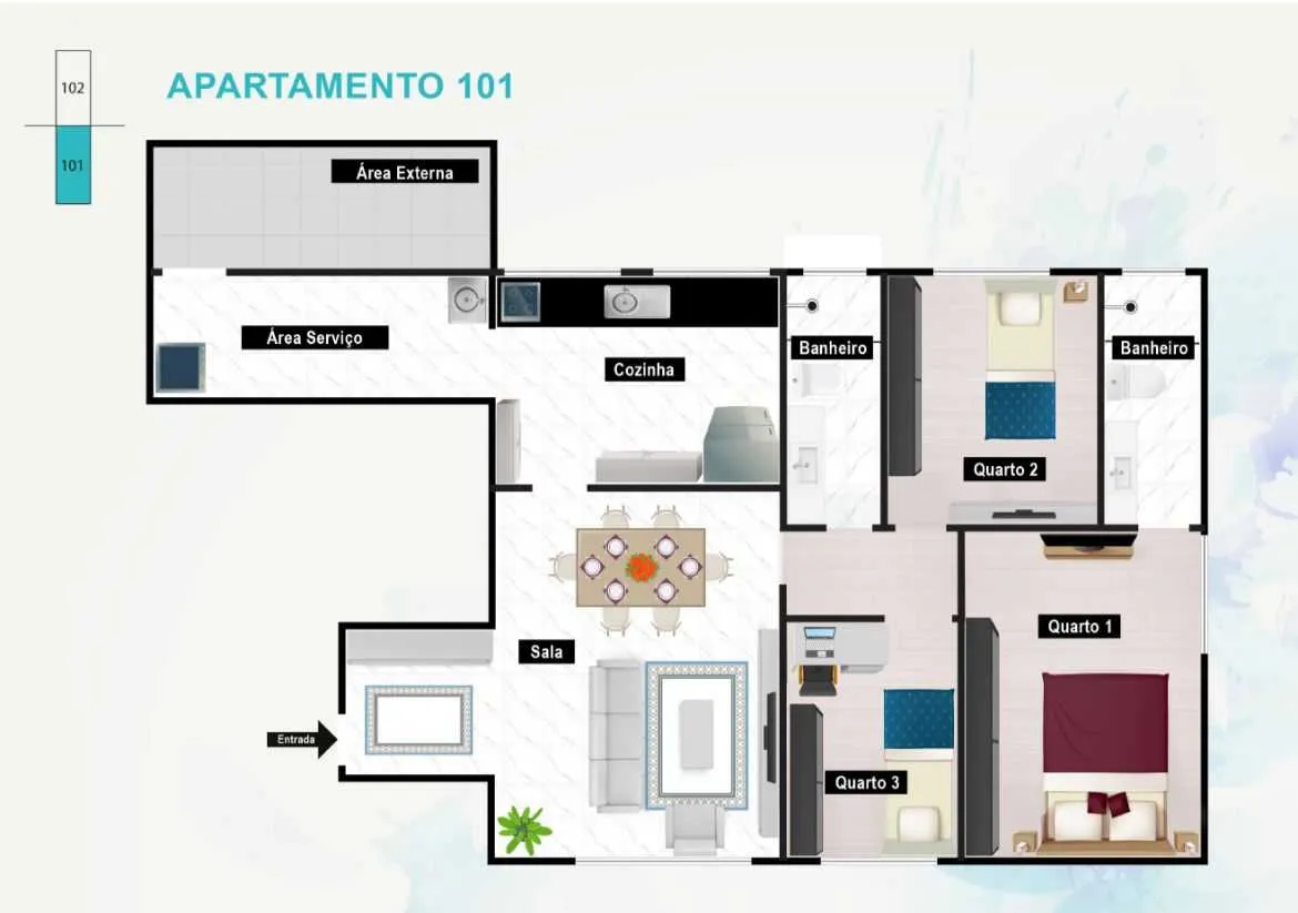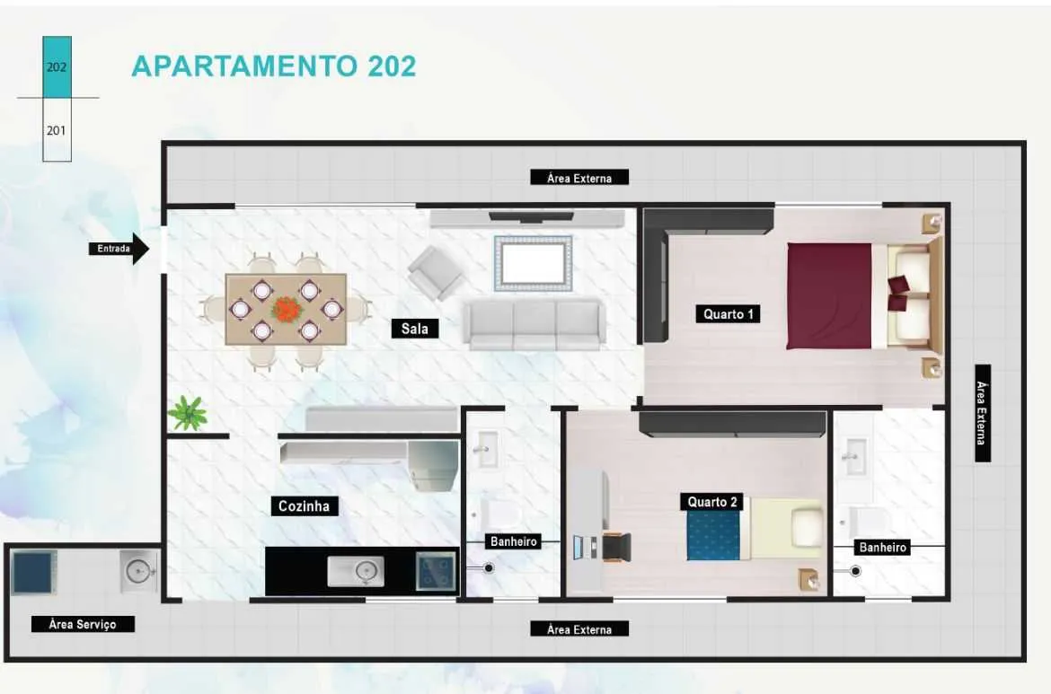 • 2 quartos, sendo 1 suíte
