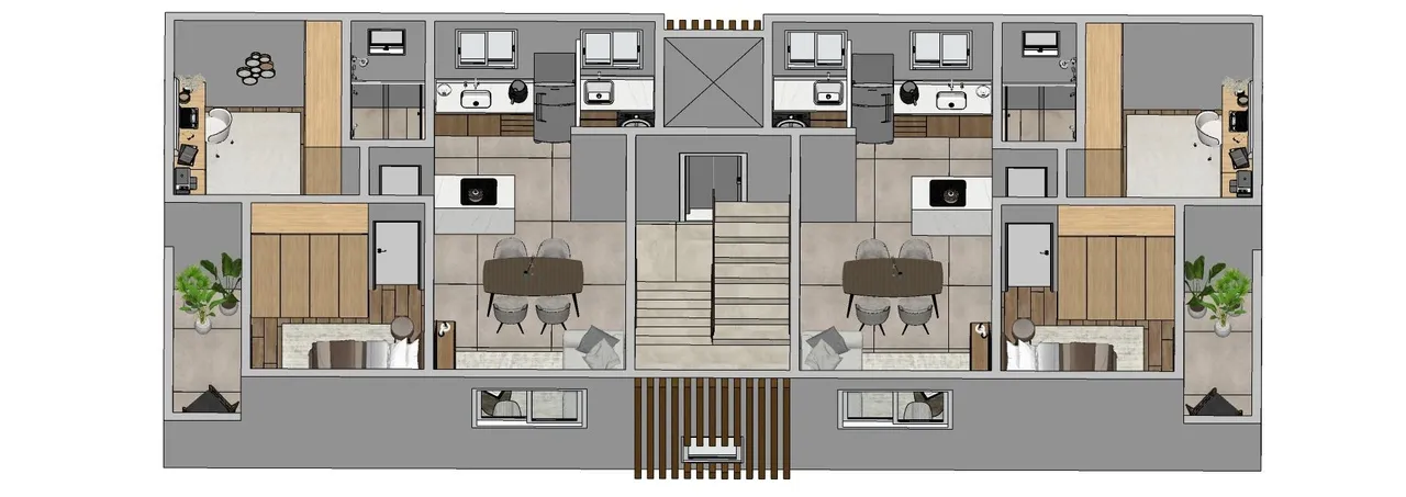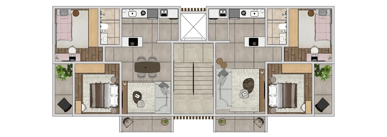 • Área total de 69 m² (57 m² de área interna + 12 m² de área privativa externa);