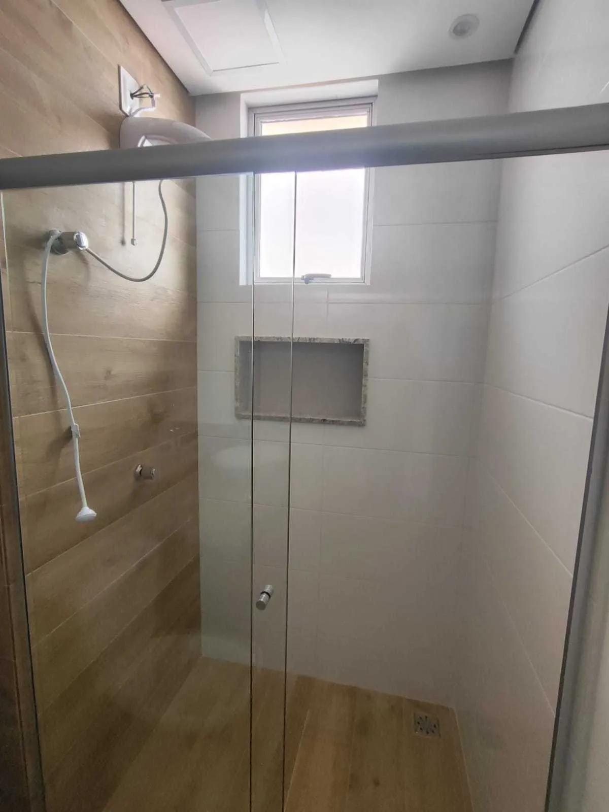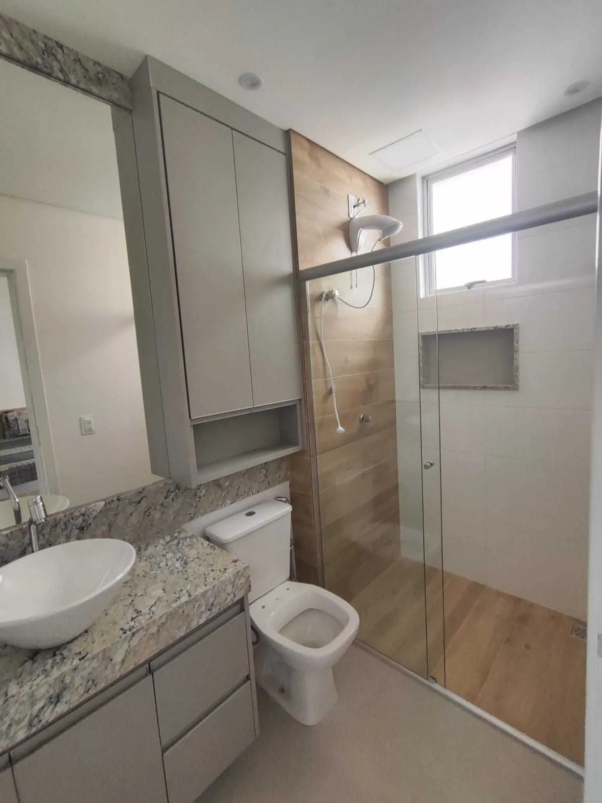 • Banheiro social com box blindex, armários, espelho e chuveiro